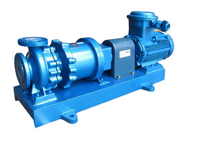 CGF無泄漏襯氟高溫磁力泵(簡稱:襯氟磁力泵)是應(yīng)用現(xiàn)代磁力學(xué)原理,利用永磁體的磁力傳動(dòng)實(shí)現(xiàn)扭矩的無接觸傳遞的一種新型泵,也就是電機(jī)帶動(dòng)外轉(zhuǎn)子(即外磁鋼)總成旋轉(zhuǎn)時(shí),通過磁場的作用磁力線穿過隔離套帶動(dòng)內(nèi)轉(zhuǎn)子(即內(nèi)磁鋼)總成和葉輪同步旋轉(zhuǎn),過流部件全部采用氟塑料制造,可輸送任意濃(強(qiáng))度的酸、堿、氧化劑等腐蝕性介質(zhì),隔離套采用特殊材料制造具有高強(qiáng)度的力學(xué)性能,消除了磁力泵存在的磁渦流現(xiàn)象,由于介質(zhì)封閉在靜止的隔離套內(nèi),從而達(dá)到無泄漏抽送介質(zhì)的目的,徹底解決了機(jī)械傳動(dòng)泵的軸封泄漏,而設(shè)計(jì)的全密封、無泄漏、無污染、耐強(qiáng)酸、高效節(jié)能的新型無泄漏耐酸泵,性能達(dá)到國際標(biāo)準(zhǔn)、可替代價(jià)格昂貴不銹鋼,特殊合金材料、進(jìn)口的化工泵。