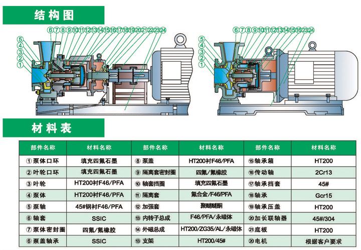 2. 泵體采用鑄鐵內(nèi)襯氟塑料(PTFE、FEP、PFA)整體燒結(jié)壓制而成,內(nèi)轉(zhuǎn)子、泵蓋、葉輪、隔離套等過流部件采用金屬嵌件外包氟塑料(PTFE、FEP、PFA)整體燒結(jié)壓制而成;