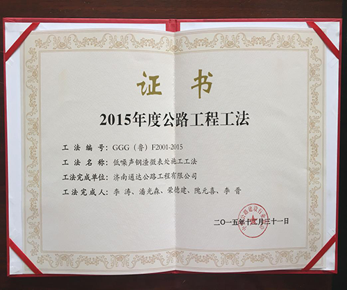 公司獲得的“低噪聲鋼渣微表處施工工法”證書
