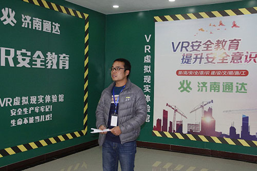 采訪現(xiàn)場,項目總工楊軍遠介紹了VR安全體驗設(shè)施的操作規(guī)范及注意事項。解說人員佩戴VR眼鏡、手持操控設(shè)備進行“安全事故”模擬體驗介紹。