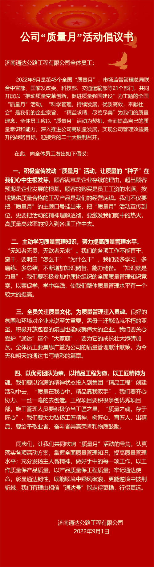 他表示,質(zhì)量是通達(dá)賴以生存的底線,是公司長久發(fā)展的保證。我們要認(rèn)真把控每一個環(huán)節(jié)、每一個細(xì)節(jié),把技術(shù)干成藝術(shù),把產(chǎn)品做成精品,打造質(zhì)量強(qiáng)國、交通強(qiáng)國通達(dá)樣板,為推進(jìn)質(zhì)量強(qiáng)企建設(shè)做出更大貢獻(xiàn),以實際行動和優(yōu)異成績迎接黨的二十大勝利召開!
