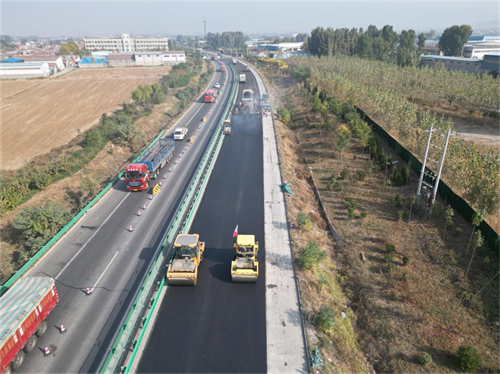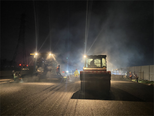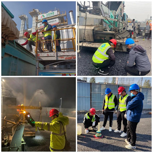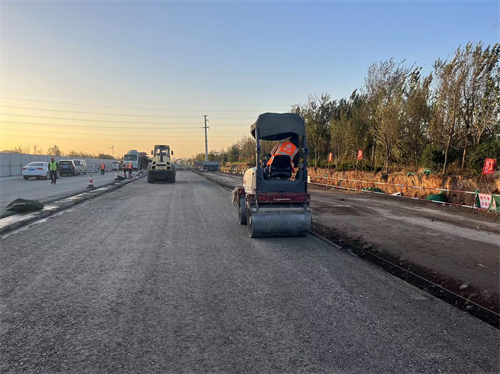 攻堅(jiān)克難,夯基提質(zhì)。為確保瀝青下面層冬季施工質(zhì)量,項(xiàng)目部及時制定《冬季施工方案》,從源頭把控,緊盯瀝青原材料全過程運(yùn)輸,對原材料質(zhì)量和技術(shù)要點(diǎn)、難點(diǎn)進(jìn)行層層交底;施工過程中嚴(yán)格把控?cái)備伜湍雺簻囟取⑺俣燃八射伜穸鹊裙に噮?shù),對攤鋪施工進(jìn)行全程監(jiān)控,確保攤鋪層平整度、厚度及壓實(shí)度等關(guān)鍵指標(biāo)符合標(biāo)準(zhǔn)要求。